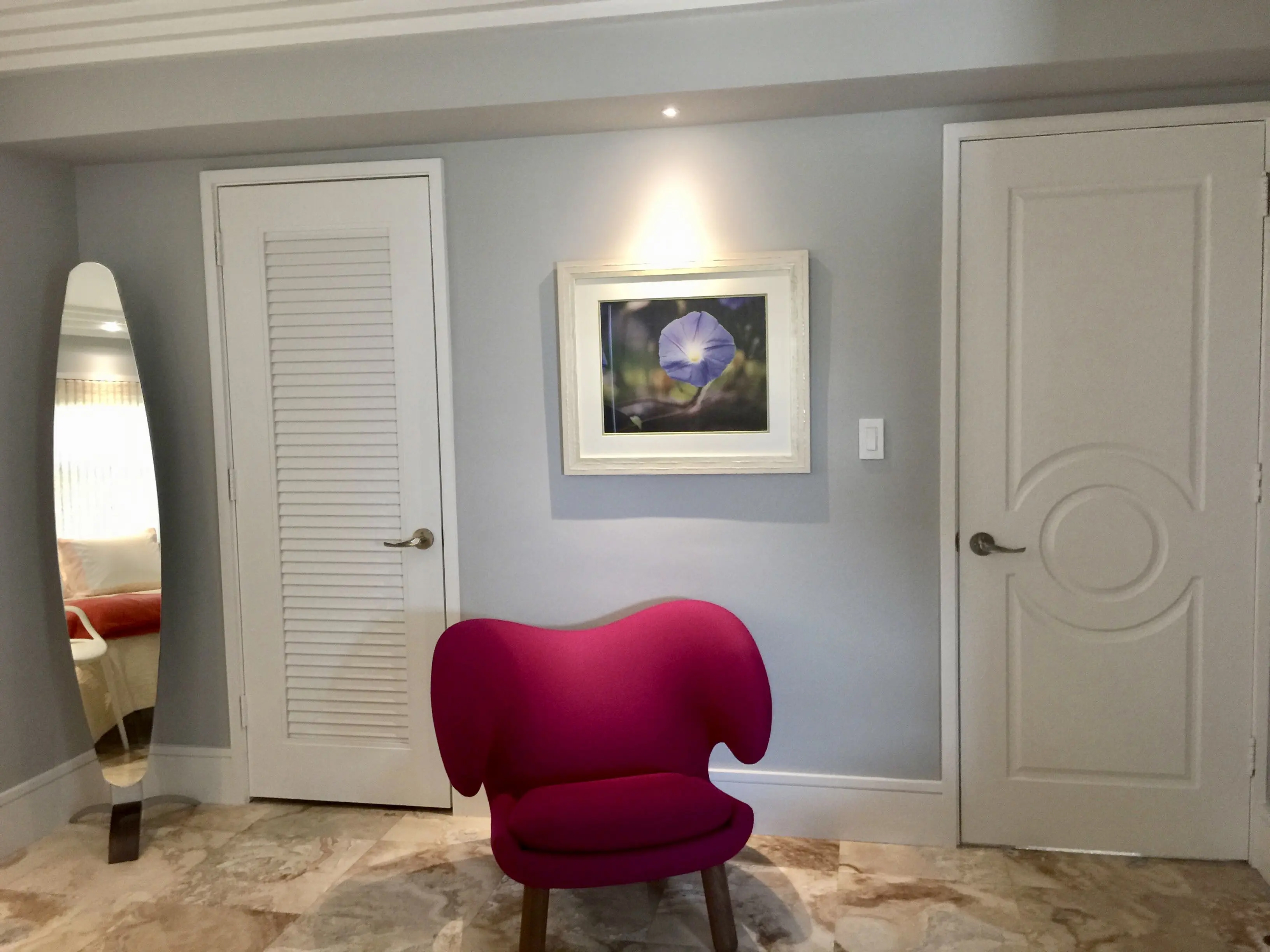 I designed this pied-a-terre in 2011 for this exquisite client. We moved walls and updated the plumbing, the electric and the HVAC before we even started the project. We expanded every room we could. Bigger closets and bigger bathrooms. Then we laid this pretty sandy, creamy marble all the way through this very special gem. An exquisite Downsview kitchen was installed with pretty pink mink cabinets. The stone we found for the counters matched the mink finish of the cabinets perfectly and the mink color Avonite for backsplash. Pink mink! We started with this stair step molding and then we put LED PUC lighting in the best step of the molding so the lighting would wash over her son's photographs perfectly. We used 3000 LED so it would have a nice warm glow for ambiance at night. Truly one of my favorite accessories are doors! We framed out every opening and put in gorgeous doors perfectly selected for each opeing and all new hurricane windows. Soft coastal hues throughout and beautiful original modern pieces. Perfect for this 1956 revival!
